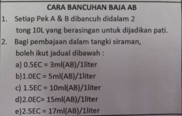 Sebelum ini mungkin terdapat salah faham dalam bancuhan baja AB. Dalam siri artikel bancuhan baja AB sebelum ini kita banyak belajar bagaimana untuk membancuh baja dengan menggunakan Electroconductivity Meter Kali ini kita belajar cara bancuh tanpa EC Meter pula. Tips penjagaan tanaman sehingga tuai.